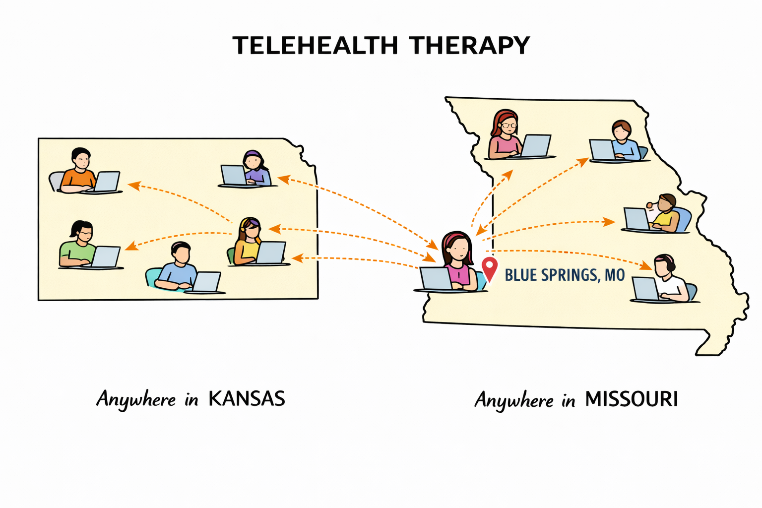 Telehealth Counselng services are open to anyone physically located in the States of Missouri or Kansas at the time of their session.